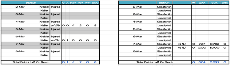 The bench players would have done nothing to contribute to breaking the 4-4 tie we suffered through in week 21. All those missing points would have only padded our totals in the categories we already won.