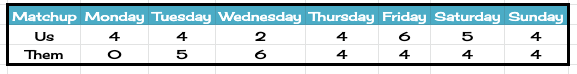 The matchup was seven days long. We were ahead on three of the days, while our opponent took the lead for two. The other days we were tied at 4-4 apiece, the final outcome.