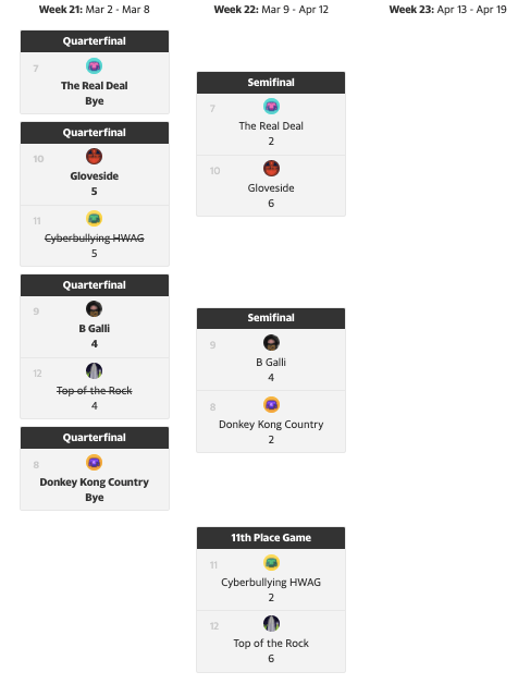 Our league had a consolation bracket for the playoffs, mainly for bragging rights amongst the bottom dwellers of the league. By default, we earned a spot in the tournament, yet were ushered right out of the semi-finals despite tying our matchup 4-4-2. It appears the higher seed gets to advance in this alternate universe, while the last place team moves on to play for the worse team championship.
