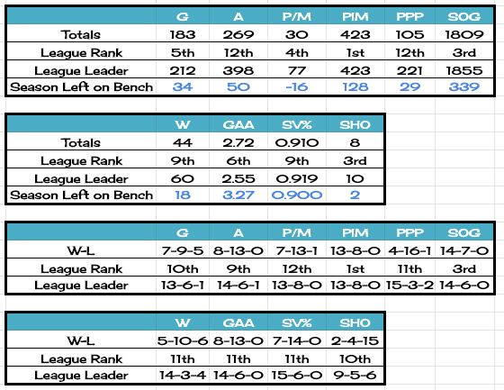 Sadly our numbers got even worse, and those places we once held have slowly slipped away. Our goalie statistics continue to drop like a brick in the ocean while our offence slowly fades into the distance. At this rate, we have to be concerned that we will lose our stranglehold on penalty minutes.