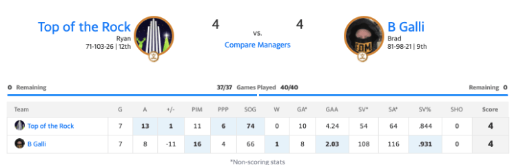 We went 4-1-1 in the six offensive categories, winning assists by five, plus/minus by 12, power-play points by two (rare), and shots on goal by eight. In the other two categories, we lost penalty minutes by five (rare), and tied goals with seven apiece.