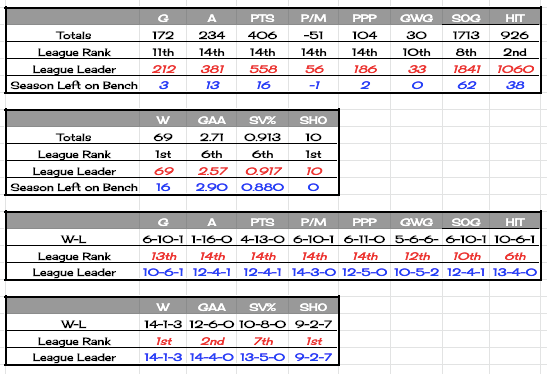Things were pretty dicey up front, where we lost by 18 points. That was by far our worse category loss since they scored 12 more goals and six more assists. The plus/minus total was a swing of 10 points in their favour while power-play points and hits were lost by three points and game-winning goals one. Our only win was in the hits department, where we collected four body checks.