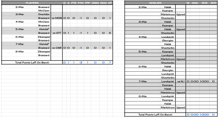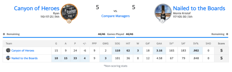 Since we won three of the four goalie categories, Henrik Lundqvist’s relief appearance had no impact on the final score. Also, Derick Brassard found himself on the bench for three games, collecting a handful of points, but nothing of significance to break the 5-5-2 tie.