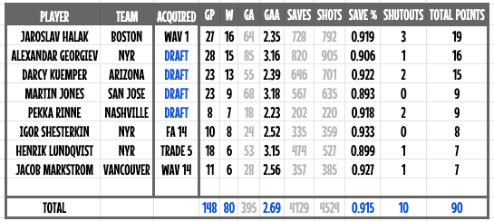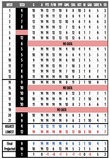 Even though we ran with an obscured number of goalies, we also failed in some of those categories too. Somehow we missed our win total by 27, which meant we still missed it by 10 if you factor in the 17 wins left on the bench. The projected GAA was tough to figure out, but it equalled some crazy number like 6.95. We finished at 2.77, which meant an improvement of 4.18, although we’d be the first admit we don’t know if we won or lost that category. We came ever so close (0.003) points away from matching the save percentage projections. As fate would have it, we managed to secure 10 shutouts, just like Yahoo projected. It only took five guys to pull that off.