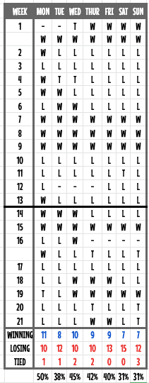 The following chart will show you that the best day of the week was the first day of the week. We were ahead (winning) in the matchup about 50% of the time. Except for Tuesday (38%), we stayed in the 40% range on Wednesday, Thursday, and Friday. As the weekend rolled around, that was about the same time we turtled (31% winning percentage) in the matchup, which resulted in our losing record.