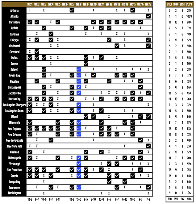 100% – We picked the Atlanta Falcons just once, in week 17, and they won. The only team that went 1-0 for a perfect selection record.