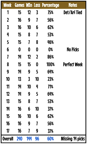 There were 254 games this past NFL season. As you may have read up above, we missed our picks in week six, which lowered our total number of games to 241, which was until the Detroit Lions and Arizona Cardinals tied in week one, reducing our total number of picks to 240.