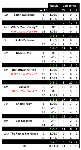 Fantasy baseball finished up with a 9-0 blow out loss to the defending league champions ItsRyanNotRyne. Neither one of us made the playoffs in 2020, so we met in the first round of the consolation bracket. The playoffs are not what this post is about. This particular write up is going to break down the entire 22 week season.