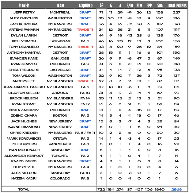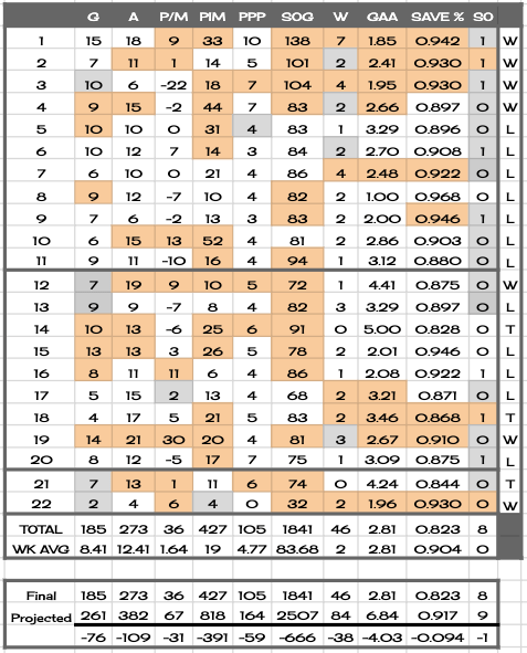As our final numbers would indicate, we were an up and down team and did not deserve to finish in the last place again. We were the sixth-ranked team in goals (185), which was 27 goals out of first place. As a team, we only had 273 assists (last place), which equalled to be 131 out of first. The assists category was by far our worse since we sat in 12th place for 21 out of 22 weeks.