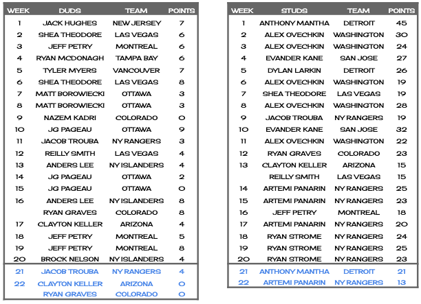 There were a total of 23 studs during our 22 week season. Washington Capitals captain Alex Ovechkin took home the crown with a total of five. His closet competition was a pair of New York Rangers, Artemi Panarin (4) and Ryan Strome (3), who accounted for seven awards. If you throw in Jacob Trouba’s single title, the Rangers secured eight crowns, which was 36% of the prizes.