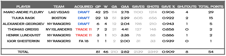 For the majority of the season, our goalies lead the league in all four categories. Even on off weeks, our numbers didn’t suffer enough to have us drop out of the top five. But as the season wore on and the losses piled up, our goalies began to flutter, and our final numbers showcase how bad things got.