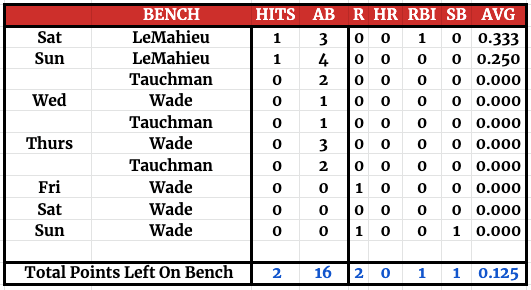 Since the majority of our team are starters, there’s not a whole lot of action going on our bench. As you can see, days that Mike Tauchman or Tyler Wade subbed into a game, really didn’t factor into our matchup totals.