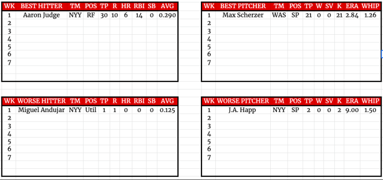 Aaron Judge was our superstar of the week, racking up an impressive 30 points all by himself. Max Scherzer turned out to be our best pitcher with 21 strikeouts.