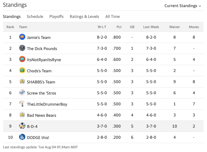 We currently sit in ninth place, only one point above DODGE this!. Jamie’s Team is our current league leader with an 8-2 record, followed by The Dick Pounds, who are 7-3 and in second place, thanks to their victory over us.