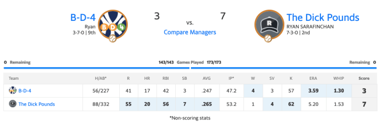 It was a clean sweep in the offensive categories for The Dick Pounds, with home runs (20-17), the closest we got to a category tie. We lost by 14 in both the runs and RBI categories and stole four fewer bases (7-3). Our team batted 0.22 under our opponents, who finished at 0.265 for the week.