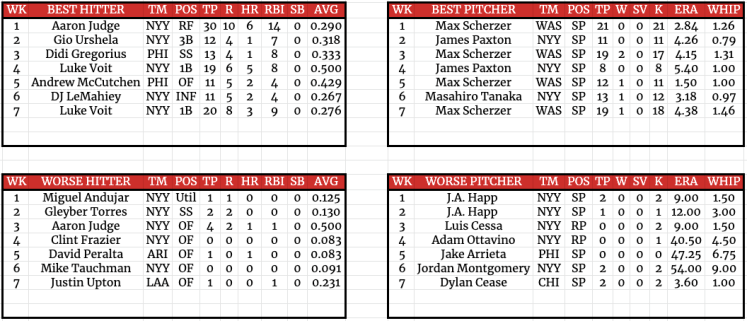 Luke Voit claimed his second player of the week award, which gave him the most on the season. His twenty points bested his nineteen points in week four. Max Scherzer meanwhile secured his fourth-best pitcher award, one that he won every other week. His 18 strikeouts were the second-best total he had on the season.