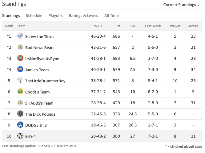 Just like the experts at Yahoo predicted, BD4 finished in the tenth seed. Our record was the complete opposite of Screw the ‘Stros, the top team. The team’s 0.300 winning percentage landed us 27 games out of the top spot and 19.5 out of fourth place, the last playoff spot. Because of the short baseball season, there was no consolidation bracket this season, so we had no chance to give those guys a run for fifth place.