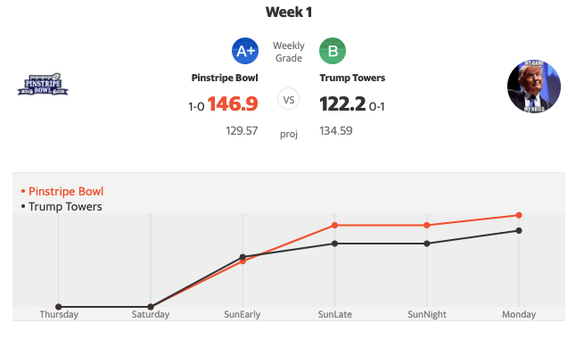 Yahoo Fantasy handed us an A+ grade for our efforts in Week 1. That’s not too shabby since we overshot our projections by 17.33 points. Trump Towers, meanwhile, failed to live up to their predictions.