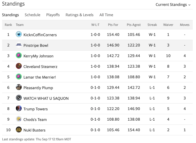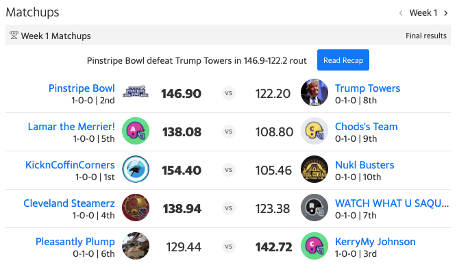 Just like other times in franchise history, Pinstripe Bowl starts the season off with a win and hang around the top of the league standings. Usually, things fall apart after a few weeks, and we end up looking in from the outside when the playoffs start.
