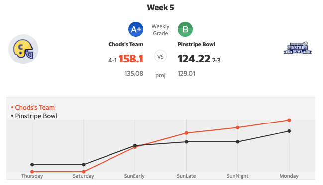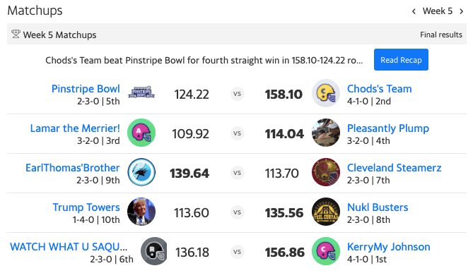 Pinstripe Bowl dropped to 2-3 on the season after suffering the league’s worse defeat of the week, 158.10-124.22, to Chod’s Team.