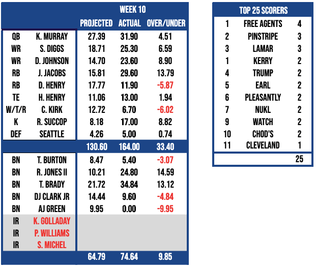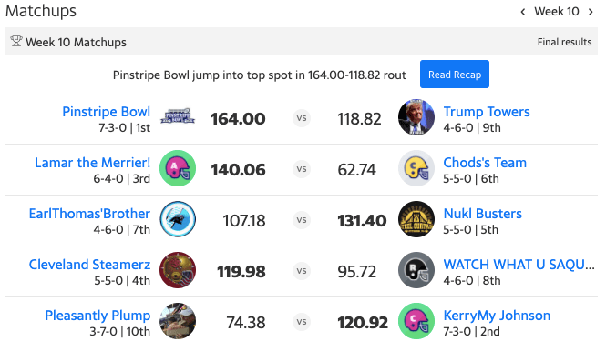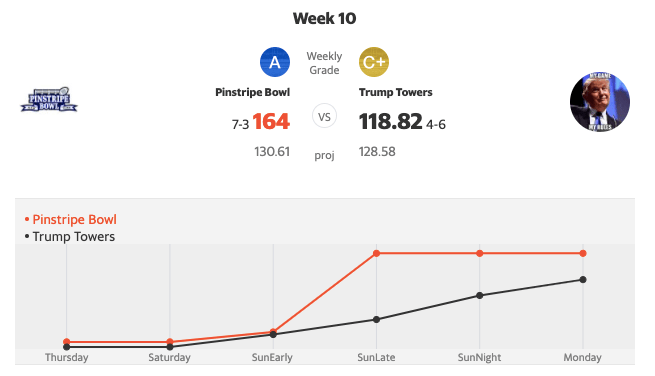 For the second time this season, Pinstripe Bowl was able to pile up the most points in a matchup, failing to best their season-high from week six (164.92). As mentioned in the opening, this win in week 10 allowed the Bowl to hop into the league’s top spot.