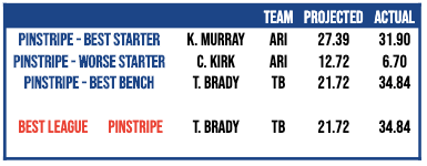 In a shocking twist of events, Pinstripe Bowl had the league’s highest-scoring player for the straight week! Even though he didn’t see any action in our lineup, Tom Brady went on to score 34.84 points in his victory.