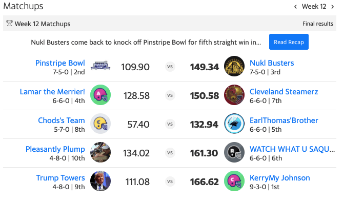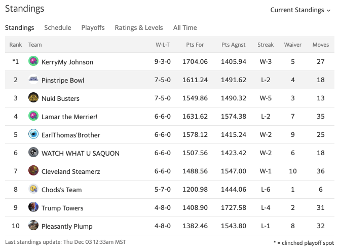 KerryMy Johnson has secured the top spot in league with only two weeks left. The Bowl remains tied with arch-rivals Nukl Busters for second overall, while the defending champions Lamar the Merrier! cling to the final playoff spot. They are currently tied with four other teams with 6-6 records; however, they currently hold the tiebreaker with 1631.62 points scored, second-most in the league.