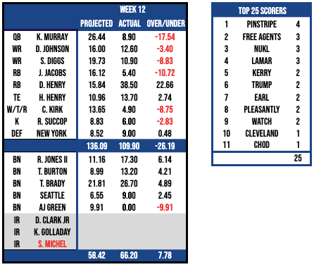 Week 12 witnessed all five victorious teams scored over 140 points, with KerryMy Johnson being the best with 166.62 points. Pleasantly Plump, Lamar the Merrier!, and Trump Towers all outscored us in their defeats. The Bowl managed the second-lowest score of the week ahead of Chod’s Team, who secured the lowest weekly total of the season with just 57.40 points.