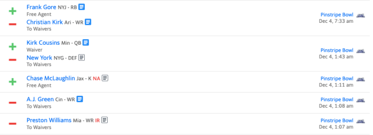 Week 13 witnessed a bunch of changes with the Pinstripe Bowl lineup. Preston Williams (Miami) was initially a draft choice but is currently injured and done for the season, which resulted in his termination. Meanwhile, late-season acquisition AJ Green (Cincinnati) was picked up and never put up the numbers to warrant a spot in the starting lineup, so we cut ties.