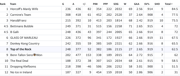This league has two oddities when it comes to rosters and statistics. Teams are only allowed to set their lineups on Monday and can not make any adjustments until the following week. Despite having great players in the lineup, their NHL schedules sometimes reduce their playing time, limiting their point contributions.