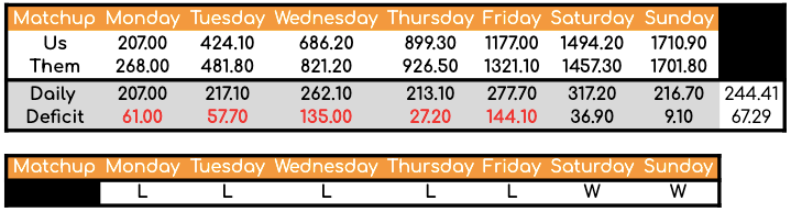 Our average for daily points was 244.41, a new season-high, while the matchup carried a 67.29 daily deficit, mostly in favour of our opponent.