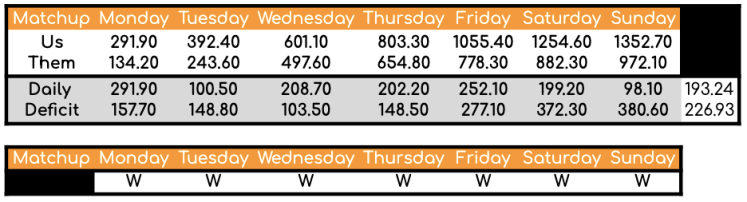 Week four was the third straight week that we scored over 1300 points, and the second week, we won a matchup without trailing for a single day.