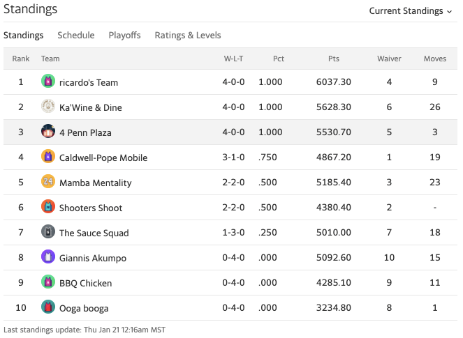 Only Ricardo’s team has eclipsed the 6000 point mark, while Ooga Booga has yet to score 4000. Shooter’s Shoot remains the only team without any roster adjustments. Two teams have made over 20 transactions while a handful is still in the teens. We remain one of three teams in single digits.