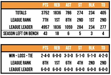 Despite losing for the first time, our overall team numbers didn’t change from the previous week. We remain the best team in the league in regards to rebounds and blocks. After that, we held onto the second spot in both steals and turnovers while finishing the week at the seventh-best team in points scored and eighth-best in assists.