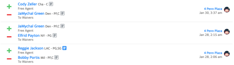 Elfrid Payton (New York) had a solid run of games where he was averaging 25 points a night. However, all good things must come to an end, and after a bunch of games in single digits, it was time to cut our losses. In his place, we grabbed JaMychal Green, who had back to back games on January 29th and 30th.