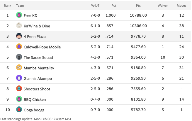 It appears Free KD and Ka’Wine & Dine have the best chances to claim the top spots, and their week nine matchup may be a preview of the championship. Yes, many things can change between now and then; however, these guys just seem to be a step ahead of everyone in terms of records and points scored.