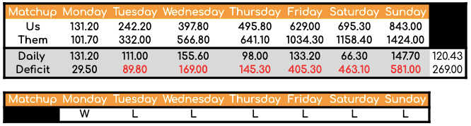 Ultimately we lost because you can’t win a matchup by only scoring an average of 120.43 points a day. When you don’t score, and your opponent continues to fill the basket, it is easy to see an average daily deficit run up to 269.00.