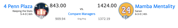 No matter how many points Penn Plaza would have scored, they were 462.25 point underdogs against Mamba Mentality. The computers at Yahoo fantasy were much nicer to us than we played because we lost by way more (581.00 points) than they initially thought.
