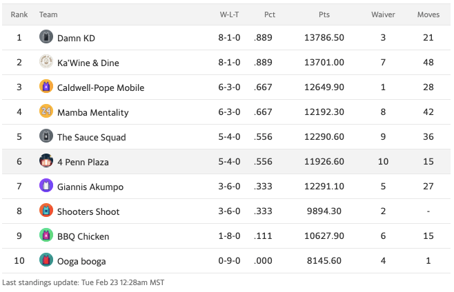 BBQ Chicken finally collected a win in week nine, leaving their cellar mates Ooga Booga as the only team without a victory. Meanwhile, Ka’Wine & Dine finally defeated the top-seeded Damn KD, handing them their first loss of the season.