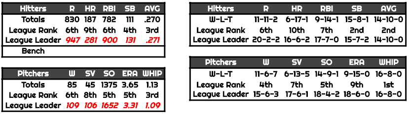 The team did not finish last in any of the ten categories. However, they did collect just enough home runs to finish as the ninth-best team in the league. Armed with only one official closer, the Row struggled to manage saves, and it showed with an eighth-place finish, the lowest of all pitching categories.