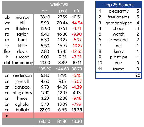 KerryMy Johnson rebounded from a blowout loss in week one to destroyed Pleasantly Plump by 53.46 points. Johnson scored the most points in week two, 177.58, setting the bar high for other teams this early season.
