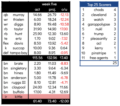 In week five, the best players on the team were the two running backs, Taylor and Kareem Hunt, who combined for 57.80 points, which accounted for 50% of the team’s totals. The wide receivers, who started, collected 23.40 points less than Chase Claypool (24.00), who sat the week out on the bench.