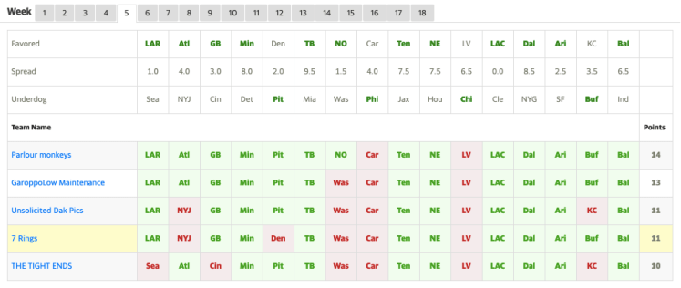 7 Rings used a 10-3 record in week 7 to remain in the pick’em pool’s top spot. Two of the three losses occurred when the underdogs came out of nowhere to shock the sports world with some significant upsets. Some may argue that one of those games wasn’t all that surprising; however, when you’ve been picked by over 90% of the population and then fail to score a single touchdown, that’s just embarrassing.