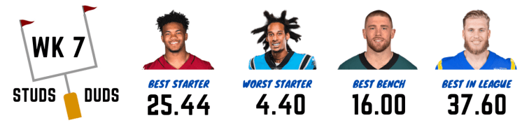 Murray was the best player on the team with 25.44 points, despite his Cardinals winning another game to remain the NFL’s only undefeated team through seven weeks. Robby Anderson (Carolina) was in the starting lineup because of many players on their bye weeks. He used the opportunity to put up his second worse game total of the season. Meanwhile, Zach Ertz (Arizona) found himself on a new team, learning a new offense. Management didn’t think he’d be up to speed in his first game but proved everyone wrong with an impressive 16 points in his Cardinals debut. Cooper Kupp (Los Angeles) earned his second-best player award, scoring a league-high 36.10 points. Kupp was the league’s best player in week one with 38.90 points.