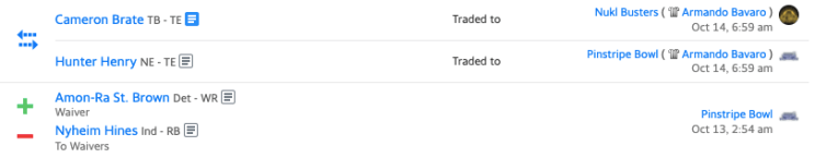 Pinstripe Bowl executed another trade with one of their rivals Nukl Busters, and this was on the heels of the mega-deal in week two that brought Diggs back home and sent Tyreek Hill (Kansas City) packing. Management initially entered a waiver claim for Hunter Herny (New England) after losing George Kittle (San Francisco) to injury and Cameron Brate (Tampa Bay) failing to fill in the gaps. When Henry went to the Busters, who had three tight ends on the roster, management reached out and secured Henry as the team’s primary TE since Ertz wasn’t lighting it up.