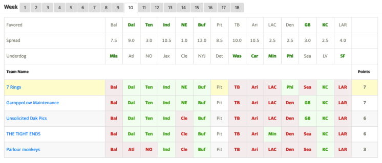 7 RIngs returned to the top of the 2021 Pick’em standings thanks to a 7-6-1 record in week ten. Once tied for first after week nine, the team opened up a massive gap, earning a five-point cushion with only a handful of weeks left.