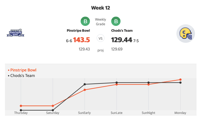 According to the graph, Chod’s Team jumped out to an early lead but plateaued by the end of Sunday while the Bowl kept plugging away en route to the victory. The matchup was initially projected to be 129.69-129.43 in favor of Chod’s Team; however, the Bowl exceeded their predictions and scored over 140 points for the third straight week.