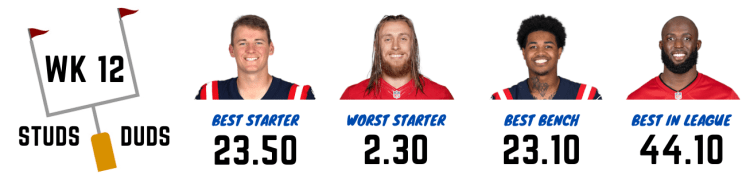Jones became the second quarterback (besides Kyler Murray) to win best player honors. His 23.50 points were the third-lowest totals of anyone to earn the award. He was joined by teammate Kendrick Bourne in the winner’s circle as Bourne scored the most points by a bench player with 23.10.