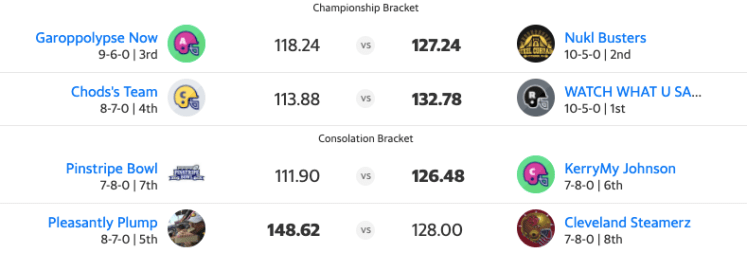 All eight teams scored into triple digits, leaving the Bowl as the lowest-scoring playoff team in the opening week. Pleasantly Plump secured the most points with 148.62 to advance on their side of the bracket. They will face off against Johnson in week 17 for the right to finish 5th or 6th in the standings. The Bowl, meanwhile, will draw Cleveland Steamerz in a rematch of a series just a few weeks back.