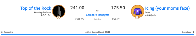 The Rock scored the second-most points in week 10, coming just five points shy of being the best. No one scored more than 246.00 points (Dirty Sanchez), and only Icing failed to reach 200. Everyone else played tightly contested matchups outside of the Rock and Icing, with the Manager-less Team picking up their fourth win by just 2.50 points over Steve’s Great Team.